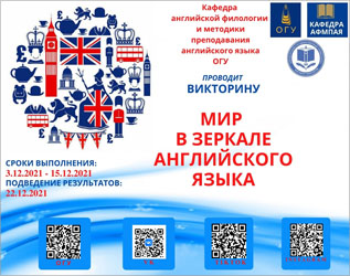 Кафедра английской филологии и методики преподавания английского языка ОГУ проводит викторину «Мир в зеркале английского языка», приуроченную к Дню открытых дверей на факультете филологии ОГУ.