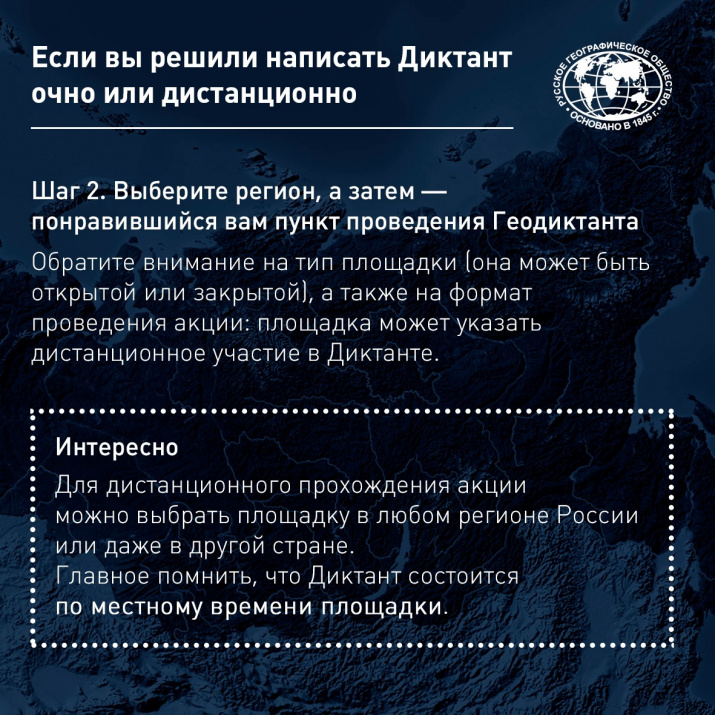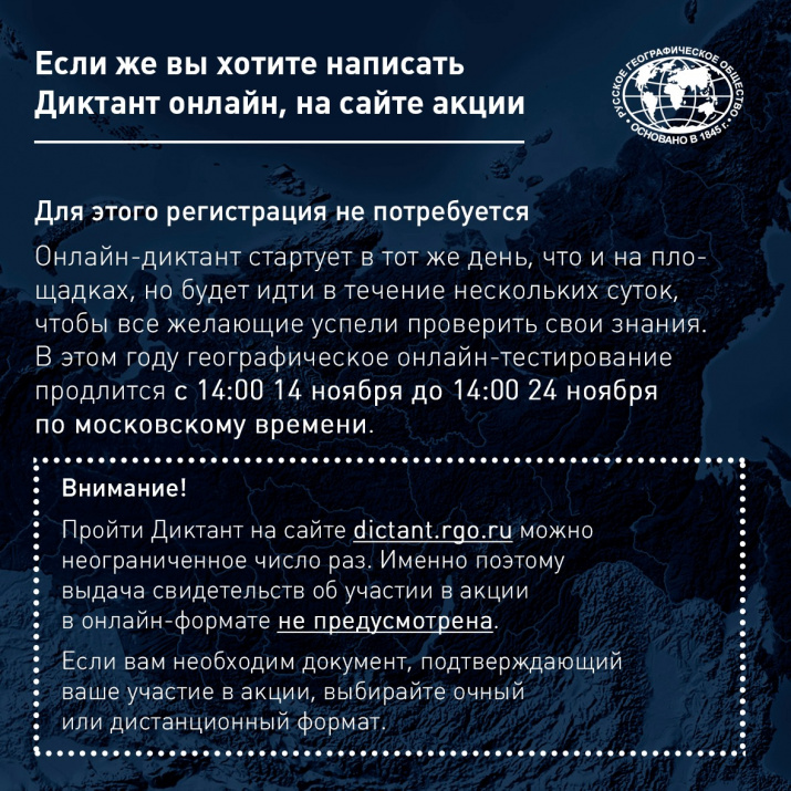 Напомним, что шестой по счёту Географический диктант Русского географического общества состоится 29 ноября в России и за рубежом. Помимо дистанционного формата, он будет проводиться также очно и в интернете. На очных площадках Диктант начнётся так же — 29 ноября в 12:00 по местному времени. Онлайн-версию Диктанта можно будет пройти с 14:00 (мск) 29 ноября до 14:00 (мск) 6 декабря на сайте проекта dictant.rgo.ru.