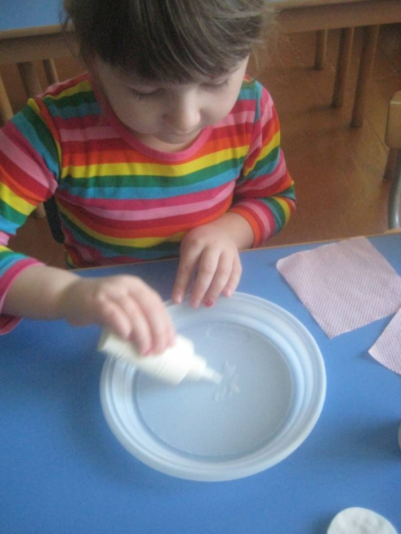 Отрабатывать: прием разметки по шаблону; умения скручивать жгутики из салфеток. Поупражнять детей в разделении ватного диска на две части. Уточняются знания о свойствах ватного диска. Проводится работа по композиционному построению изображения.