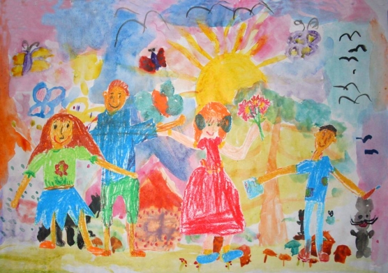 Данил В., Даша Д. Коллаж «Подарю улыбку миру» (акварель,восковые мелки)