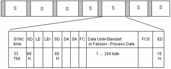 Центральный контроллер (ведущее устройство) считывает входные данные из известного устройства и посылает назад известному устройству исходные данные. Важно то, что цикл шины короче программного цикла контроллера, который в большинстве прибавлений равняется приблизительно 10 мс. Структура кадра Profibus-DP представлена на рисунке 3.26.