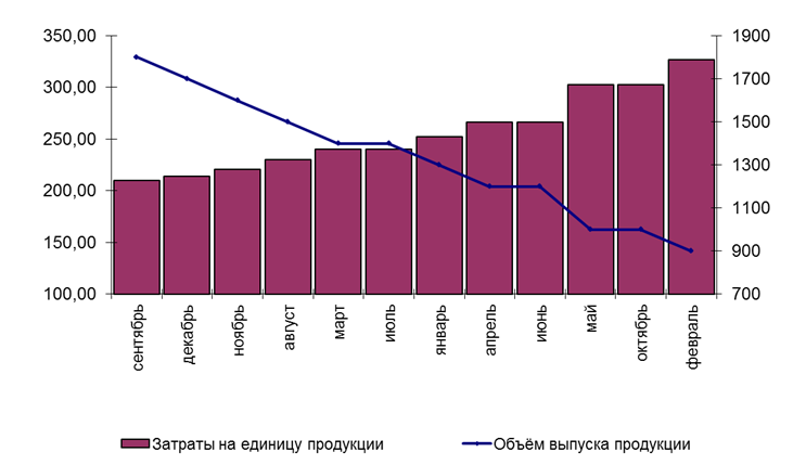 Рисунок 7 – Зависимость удельных затрат на единицу от объёма выпуска продукции